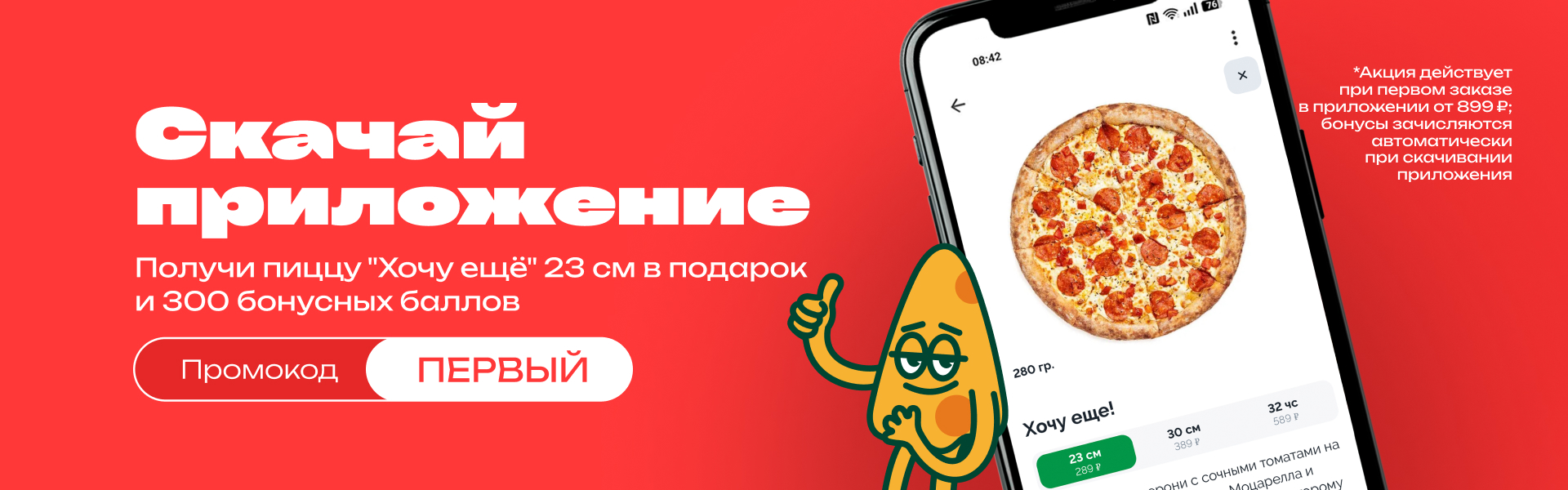 По промокоду ПЕРВЫЙ дарим пиццу «Хочу еще!» 23см при заказе от 890₽ на первый заказ для новых клиентов💛